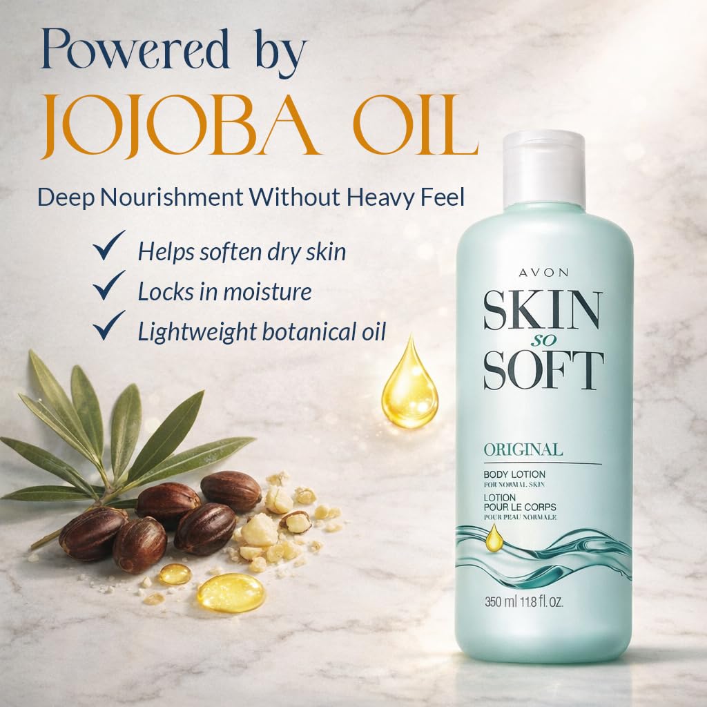 - 𝗦𝗜𝗟𝗞𝗬-𝗦𝗢𝗙𝗧 𝗝𝗢𝗝𝗢𝗕𝗔 𝗚𝗟𝗢𝗪 - Avon Skin So Soft Original moisturizing body lotion for women wraps your skin in fast-absorbing jojoba oil nourishment that delivers all-day softness without the heavy, greasy feel of ordinary body moisturizers.
